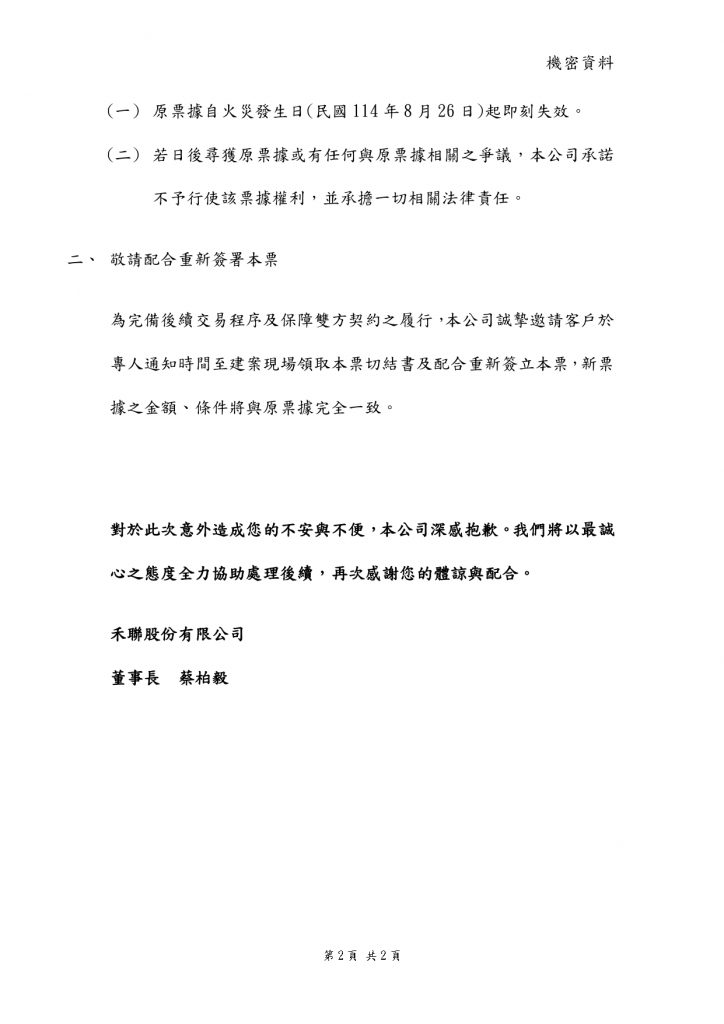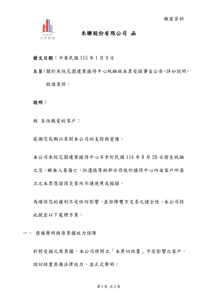 為保障您的權益,若您名列附件所示戶別,敬請儘速與禾悅花園接待中心聯繫,以利安排後續辦理。