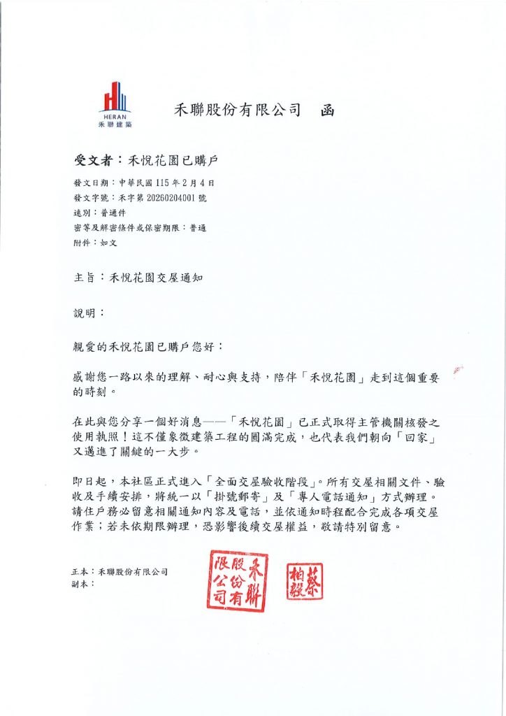 為保障您的權益,若您名列附件所示戶別,敬請儘速與禾悅花園接待中心聯繫,以利安排後續辦理。